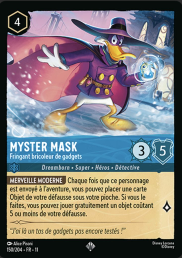 * Une carte très rare saphir avec là aussi un nouveau personnage qui est Mister Mask – Fringant Bricoleur de Gadget, carte qui coûte 4, force 3 et volonté 5, lore à 1. Chaque fois qu’il est envoyé à l’aventure vous pouvez placer un objet de votre défausse sous votre pioche, et jouer ainsi gratuitement un objet de votre défausse qui coûte 5 ou moins.