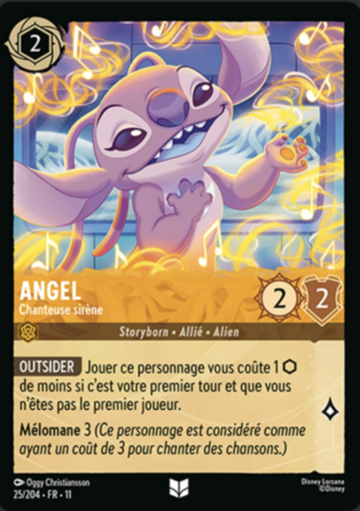 * Une carte ambre peu commune avec le nouveau personnage du jeu Angel – Chanteuse Sirène, coûte 2, force 2 et volonté 2, lore à 1, est mélomane 3 et vous coûte 1 encre de moins si c’est votre premier tour sans être premier joueur. Cette particularité est très intéressante dans le jeu, puisque le joueur qui jusque là commençait la partie était plutôt avantagé.