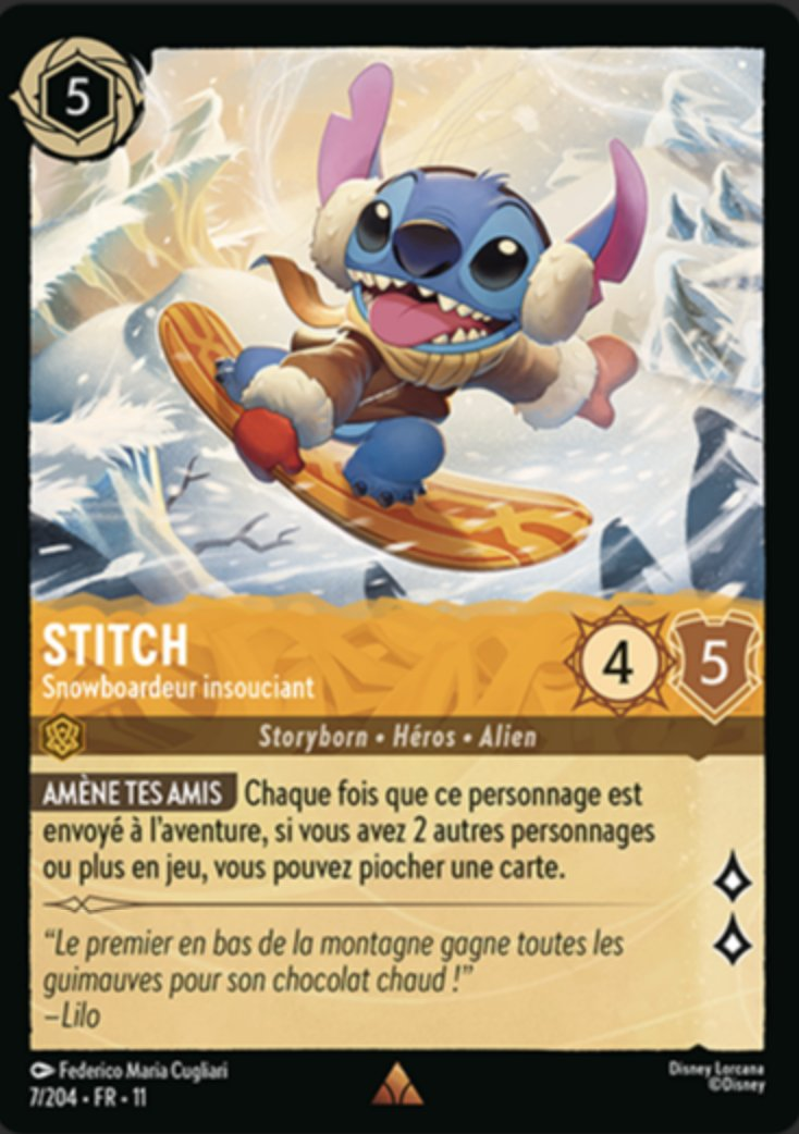 * Une carte ambre rare Stitch – Snowboarder Insouciant, coûte 5, force 4 et volonté 5, peut lorer à deux, et permet de piocher en allant à l’aventure si vous avez au moins 2 autres personnages en jeu.